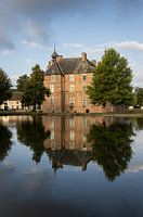 Zonnig uitzicht in de vroege ochtend op kasteel Cannenburgh (Cannenburch) in Vaassen in Gelderland in Nederland. Prachtige weerspiegelingen in het kalme water van het meer dat het kasteel omringt, terwijl de zonnestralen de 16e-eeuwse gevel verlichten.