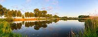 Vroege ochtend zonlicht over de Kleine Bouwkolk aan de Zwartendijk bij Kampen tijdens een mooie lentemorgen. Breed panorama beeld met een reflectie van de bomen op het wateroppervlak.