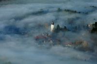 het dorp Titisee im Morgennebel, herfst, Titisee-Neustadt, Zwarte Woud, Baden-Württemberg, Duitsland
