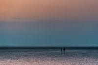 Drie mensen tijdens een vroege ochtendwandeling op het wad van de Noordzee in Dorum in zacht licht