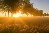 Vroeg in de ochtend komt de zon op tijdens een mooie lentedag over de Zwartendijk, de oude Zuiderzeedijk in de IJsseldelta bij Kampen in Overijssel.