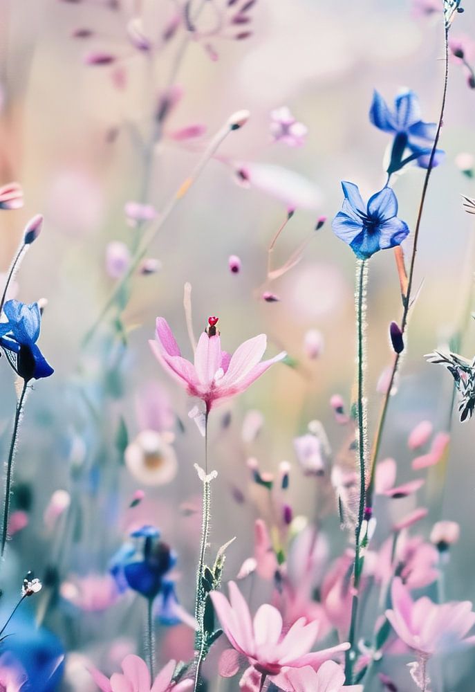 Details: bloemen, tuin, blauw, roze, groen, schilderij, bloemen schilderij, kunst, natuur, bloeiende planten