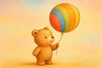 Een vrolijk beertje met ronde oren houdt een regenboogkleurige ballon vast, omlijst door een zachte pastelgloed. De warme achtergrond verloopt subtiel, waardoor het duidelijke ballonpatroon extra oplicht. Fijne lijnen en zachte schaduwen geven het beertje diepte en een vriendelijke uitstraling. De compositie is rustig met royale…