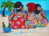 Kleurrijke dames gezellig samen chillen op het strand met een wijntje van de kunstenaar Renate Rolefes.