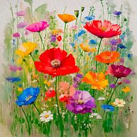 Koop dit landschapskunstwerk Vrolijk en zomers bloemenveld. Kleurige Klaprozen van Studio Pieternel op canvas, aluminium dibond, (ingelijste) fotoprint, behang en ArtFrame, op maat geprint in Fine-Art kwaliteit.