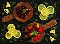 Vrolijk ,fris , stilleven met Citroenen, granaatappel,annanas,aardbeien, basilicum en groen sesamzaad op houten lepels.