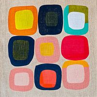 Abstract werk met oranje, geel, roze en blauwe vlakken op een neutrale canvas achtergrond.