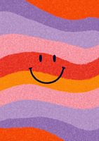 Dit kunstwerk toont een schattig, lachend gezichtje te midden van kleurrijke, golvende strepen in een retro behangstijl. Pasteltinten van paars, oranje, roze en rood worden gecombineerd met korrelige textuur en platte illustratie om een charmante, eenvoudige compositie te creëren. De vintage patronen en zachte kleurovergangen creëren een vrolijke, speelse sfeer. Het ontwerp combineert minimalisme, retro-esthetiek en levendige kleuren en creëert een speels, grafisch kunstwerk dat vreugde uitstraalt en doet denken aan klassiek behang en vintage illustraties.