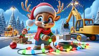 De scène speelt zich af in een besneeuwd rendierdorp dat zich voorbereidt op de komende kerstfestiviteiten. Op de voorgrond zien we een schattig rendiertje, gekleed in een feestelijke muts en een warme sjaal. In zijn poten houdt hij een kleurrijk lichtsnoer, dat traditioneel wordt gebruikt voor kerstversiering. Achter hem flitst een ander rendier met een rode neus vrolijk op, schijnbaar springend uit een houten kist vol kerstschatten. Op de achtergrond is een gele graafmachine hard aan het werk om het land te egaliseren voor de festiviteiten, omringd door besneeuwde dennenbomen en een verstild nachtlandschap. Straatlantaarns verspreiden een zacht licht dat samen met de zachte schemering en de sterren aan de hemel een warme en uitnodigende sfeer creëert. De foto zit vol leven en vreugde, elk detail is zorgvuldig bewerkt om de verwachting en magie van het kerstseizoen vast te leggen.