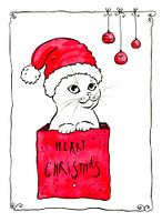Merry Christmas schattige kat is een zwart-witte inkttekening handgeschilderd met aquarelverf door de kunstenaar Karen Kaspar.