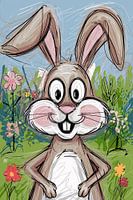 Dit vrolijke en speelse ontwerp toont een glimlachend konijn te midden van kleurrijke bloemen en planten. Het gebruik van dynamische lijnen en heldere kleuren geeft de illustratie een frisse, moderne uitstraling, perfect voor een gezellige en levendige ruimte. De zachte tinten van het konijn, gecombineerd met de levendige achtergrond, zorgen voor een vrolijk en positief geheel dat een glimlach op ieders gezicht tovert. Of je nu op zoek bent naar een leuk detail voor in de kinderkamer of een speelse touch in de woonkamer, deze illustratie brengt gegarandeerd energie en vrolijkheid in elke ruimte.