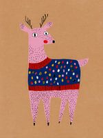 Dit kunstwerk brengt direct een glimlach op je gezicht. Een roze rendier met een nieuwsgierige blik draagt een blauwe trui vol kleurrijke stippen, alsof het zich klaarmaakt voor een winterfeest. De warme beige achtergrond laat de felle kleuren nog meer opvallen, waardoor het geheel een zachte maar vrolijke uitstraling krijgt. De combinatie van eenvoudige lijnen en levendige kleuren maakt het werk speels en eigentijds. Het rendier lijkt bijna persoonlijkheid te hebben – een beetje verlegen, maar vol charme. De kleine details, zoals de fijne streepjes in de vacht en het rode accent rond de hals, geven het werk een handgemaakt gevoel. Het is een illustratie die warmte en humor samenbrengt, perfect voor de feestdagen of om het hele jaar door wat kleur aan je interieur toe te voegen.