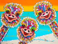 Kleurrijke Zonsondergang met drie vrolijke struisvogels van de kunstenaar Renate Rolefes.