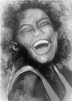 Een vrolijk lachende vrouw. Het is een in zwart wit omgezet schilderij wat weer een ander effect geeft. Het is een beetje wazig waardoor haar vrolijke lachende mond met mooie witte tanden nog beter uitkomt.