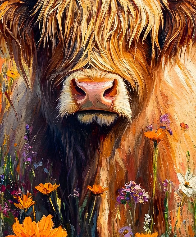 Een charmante Schotse Hooglander staat majestueus tussen een zee van kleurrijke wilde bloemen, waarmee de schoonheid van natuur en boerderijleven op een betoverende manier samenkomen.