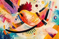 Vrolijke Kip - Dit is een kleurrijk schilderij van een kip met een opvallende rode kam, omringd door abstracte vormen en vrolijke kleuren, wat het een speelse uitstraling geeft.