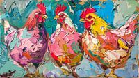 Dit vrolijke, expressieve, trendy kunstwerk is een levendige weergave van drie kippen, uitgebeeld in een rijke verscheidenheid aan kleuren door de impasto schildertechniek.