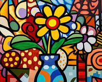 Vrolijke Kleuren en Bloemen - In dit bloemen schilderij zie je een grote, gele bloem in een vaas, omringd door kleurrijke vormen en abstracte achtergronden in vrolijke kleuren.