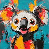 Een kleurrijk portret van een koala met grote ogen en een brede glimlach. De expressieve verfstreken en felle tinten geven dit werk een speelse en levendige uitstraling. Een vrolijke blikvanger die warmte en plezier toevoegt aan elk interieur.