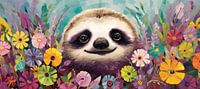 Vrolijke Luiaard Portret | Luiaard Kunstwerk - Het kunstwerk presenteert een innemende luiaard wiens vriendelijke gezicht ontspannen uit een levendig bed van gestileerde bloemen emergeert. De expressieve penseelstreken en rijke, gesatureerde kleuren verlenen het schilderij een moderne, vrolijke uitstraling die een welkome dosis charme…
