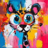 Een speels portret van een panter met grote ogen en een levendige blik. De expressieve verfstreken en felle kleuren maken dit werk energiek en vrolijk. Een echte blikvanger die meteen kracht en humor toevoegt aan elke ruimte.