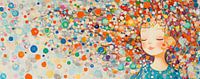 Vrolijke Stippen - Dit kleurrijke vrouwen schilderij toont een meisje met gesloten ogen en een serene glimlach, omgeven door een zee van levendige, abstracte cirkels en stippen die haar haar en kleding lijken te vormen, in verschillende tinten blauw, oranje, geel en groen.