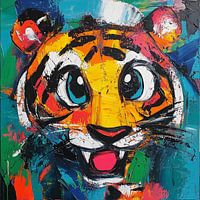 Een expressief portret van een tijger met grote ogen en een speelse glimlach. De felle kleuren en krachtige verfstreken geven het werk energie en karakter. Een vrolijke blikvanger die direct levendigheid en warmte toevoegt aan elke ruimte.
