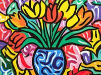 Vrolijke Tulpen - Op dit bloemen schilderij zie je een felgekleurde vaas met verschillende tulpen in rood, geel en oranje, omgeven door een vrolijke achtergrond met diverse kleuren en vormen.