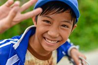Een vrolijk lachende Vietnamese jongen met een blauw petje op zijn hoofd en pretoogjes maakt een V teken met zijn vingers.