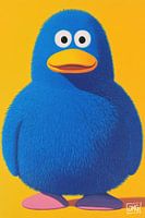 Vrolijke Vogel | Quirk Alert - Dit vogel schilderij toont een felblauwe, pluizige vogel met grote witte ogen en een oranje snavel tegen een levendig gele achtergrond, wat een speelse en verrassende uitstraling geeft.