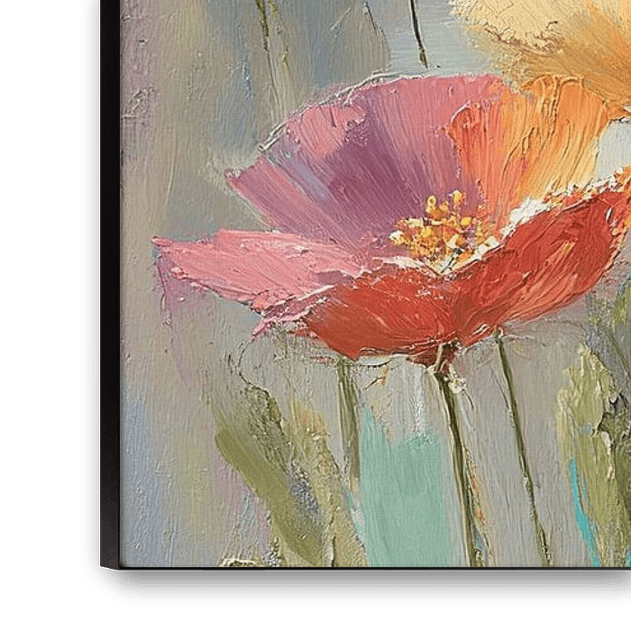 Vrolijke bloemen in kleuren - Op dit bloemen schilderij zie je kleurrijke bloemen in verschillende vormen en kleuren zoals oranje, roze en blauw, die samen een vrolijke en levendige uitstraling geven.