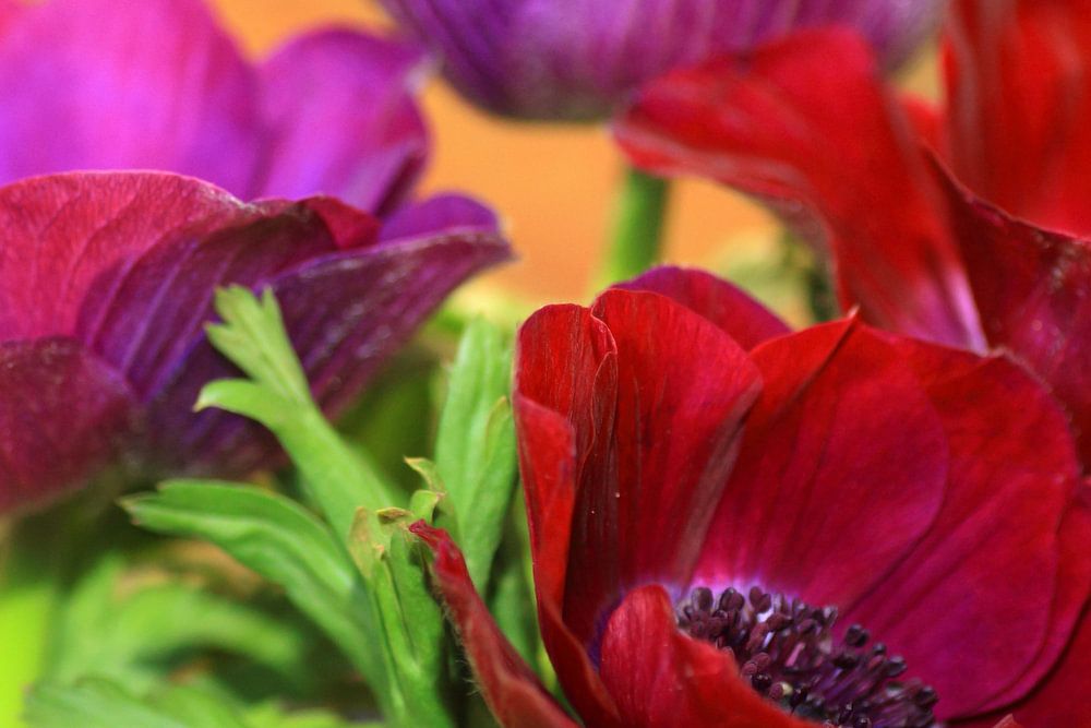 Rode anemonen bloemen met een achtergrond van warme kleuren.