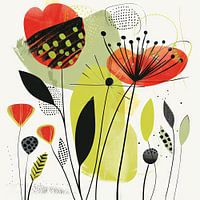 Deze kleurrijke illustratie van bloemen betovert met zijn heldere rood-, groen- en geeltinten. De moderne, gestileerde bloemvormen en levendige compositie brengen vreugde en frisheid in elke kamer. Dit kunstwerk is ideaal voor liefhebbers van illustraties en natuurmotieven en creëert een vrolijke en uitnodigende sfeer. Perfect voor woonkamers, kantoren of kinderkamers, het is een blikvanger die positieve energie uitstraalt.