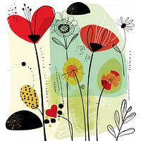 Deze kleurrijke illustratie van bloemen betovert met zijn heldere rood-, groen- en geeltinten. De moderne, gestileerde bloemvormen en levendige compositie brengen vreugde en frisheid in elke kamer. Dit kunstwerk is ideaal voor liefhebbers van illustraties en natuurmotieven en creëert een vrolijke en uitnodigende sfeer. Perfect voor woonkamers, kantoren of kinderkamers, het is een blikvanger die positieve energie uitstraalt.