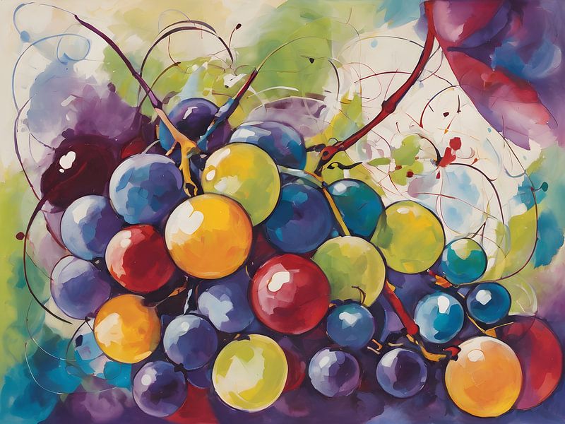 Koop dit schilderij Vrolijke druiven in expressieve penseelstreken van Bart Veeken als reproductie op canvas, aluminium dibond, (ingelijste) fotoprint, behang en ArtFrame, op maat geprint in Fine-Art kwaliteit.