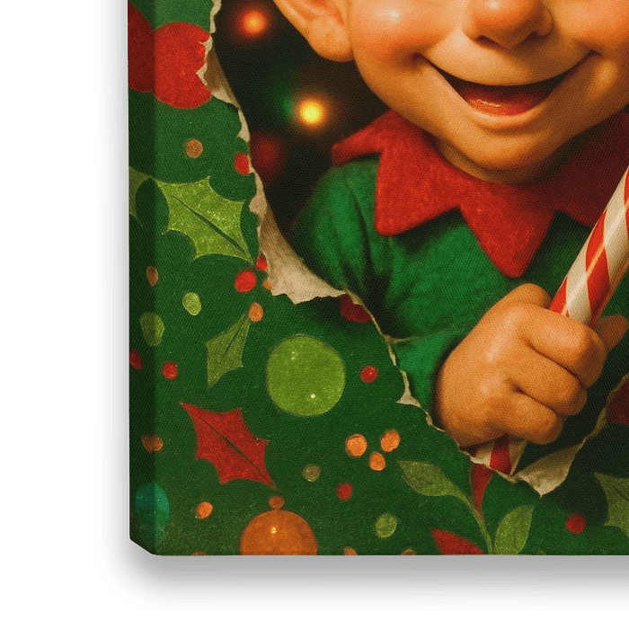 Dit kunstwerk toont een gelukkige kerstelf die vrolijk door een uitgescheurde kerstwikkel kijkt, met een grote glimlach op zijn gezicht. De elf draagt een traditionele kerstoutfit, inclusief een felgroene trui en een rode hoed met witte rand, en houdt een gestreepte zuurstok vast. De kleurrijke achtergrond met kerstballen en hulstbladeren in helder groen, rood en goud voegt een speelse, feestelijke sfeer toe aan het geheel. Het licht van de kerstboomlichtjes die door de wikkel schijnen, versterkt de magie van het moment. Dit schilderij roept direct de vreugde en energie van het kerstseizoen op, perfect voor wie van speelse, vrolijke kerstkunst houdt. Het is een charmante en kleurrijke weergave van de feestdagen die een glimlach op elk gezicht zal toveren.