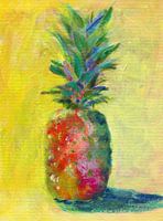 Deze vrolijke, kleurrijke ananas is een spontaan geabstraheerd portret van een verse ananas. Het is geschilderd in een losse stijl met gedurfde penseelstreken, texturen en felle kleuren. Mijn man had een verse ananas gekocht. Toen ik 's ochtends in de keuken het ontbijt klaarmaakte, lachte deze vrucht naar me en fluisterde: "Schilder mij." Dus dat deed ik - inspiratie is overal! 240