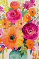 In dit vrolijke schilderij versmelt de charme van de mid-century stijl met de levendigheid van de lente. Een vaas in het midden springt in het oog en presenteert een boeket abstracte bloemen in een dynamische compositie. De warme tinten roze en oranje domineren het schilderij en geven het een stralende levendigheid die het seizoen van ontwaken perfect weergeeft. Elke penseelstreek is een artistiek statement dat de naïef moderne benadering benadrukt en tegelijkertijd een eigentijdse elegantie uitstraalt. De abstracte vormen van de bloemen roepen een tijdloze esthetiek op die wordt gekenmerkt door eenvoud en diepte tegelijkertijd. De combinatie van felle kleuren en abstracte vormen creëert een dynamische energie die de kijker boeit en meeneemt naar een wereld van levendige kleuren en vormen. Dit kunstwerk is meer dan een schilderij; het is een ode aan de schoonheid van de lente, gevangen in een tijdloze stijl die de essentie van het seizoen perfect weergeeft en viert in een feestelijke uitbarsting van kleur en vorm.