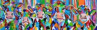 Hedendaagse kleurrijke koeien uit Nederland .De dieren kijken je aan vanaf het doek en vrolijk de ruimte in .Een kleurrijk tafereel met nieuwsgierige snuitjes .Een combinatie met zowel een figuratieve abstracte schilderstijl.