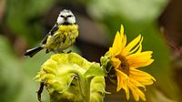 Koop de foto Vrolijke pimpelmees op zonnebloem – natuurmoment in de regen van Saranda in t Veld Fotografie op canvas, aluminium dibond, (ingelijste) fotoprint, behang en ArtFrame, op maat geprint in Fine-Art kwaliteit.