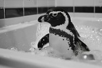 Koop de foto Vrolijke pinguïn in bad - een betoverende badkamerfoto voor je WC van Poster Art Shop op canvas, aluminium dibond, (ingelijste) fotoprint, behang en ArtFrame, op maat geprint in Fine-Art kwaliteit.