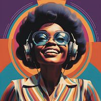 Dit kunstwerk straalt energie en vreugde uit, met een duidelijke knipoog naar de pop-art stijl die populair werd in de jaren 60 en 70. De levendige kleuren, zoals het felle oranje, blauw en paars, zijn sterk contrasterend en brengen een dynamiek die onmiddellijk de aandacht trekt. De afbeelding van de vrouw, lachend met een zonnebril en…