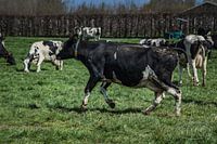 De koeien komen voor het eerst weer naar buiten in de weiland. Vrolijk springende zijn ze lekker buiten op het gras.