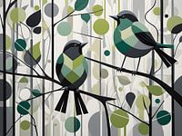 Vrolijke vogels in geometrisch kunstwerk van Bart Veeken