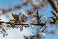 Prachtige lente bloemetjes heeft de japanse kers, je ziet dat de bloemen grote meeldraden heeft om de weinig insecten die er zijn in de lente aan te trekken.
