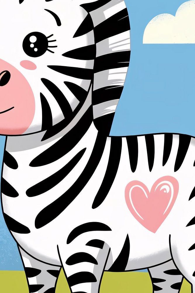 Deze vrolijke en kleurrijke illustratie toont een schattige zebra met een hartvormige vlek op zijn lichaam. De zebra heeft grote, stralende ogen en een brede glimlach, wat hem een vriendelijke en charmante uitstraling geeft. De achtergrond is eenvoudig maar effectief, met een blauwe lucht en een grasveld vol bloemen, wat een speelse en positieve sfeer creëert. Dit ontwerp zou perfect passen in een kinderkamer, waar het kan bijdragen aan een vrolijke en uitnodigende sfeer. De eenvoud en het gebruik van zachte kleuren maken het ideaal voor jongere kinderen, terwijl het ook aantrekkelijk blijft voor volwassenen die van speelse kunst houden.