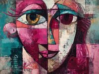 Vrouw Aanzicht - Dit is een vrouw schilderij met een opvallend gezicht dat wordt gekenmerkt door grote ogen en levendige kleuren zoals roze en turquoise, wat het een moderne en expressieve uitstraling geeft.