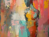 Details: abstract schilderij, vrouw schilderij, kleurrijk portret, moderne kunst, figuur, abstractie, oranje, turquoise, roze, kunst