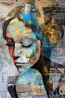 Vrouw Abstract | Abstracte Vrouw Met Zachte Kleuren - In dit abstract schilderij zie je een vrouw met een serene uitstraling, waarbij haar gezicht staat in een combinatie van zachte kleuren zoals goud, blauw en rood, die samen een moderne en artistieke sfeer creëren.