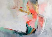Details: abstract schilderij, vrouw schilderij, moderne kunst, minimalisme, roze, groen, goud, abstract portret, vrouw met oorbel, hedendaagse kunst